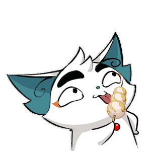 Lil Pai, the Peking Opera Cat, happily enjoys a skewer of delicious fishballs, looking up with delight.