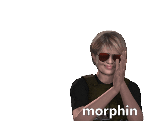 Linda Hamilton as Sarah Connor, a cartoon character, makes a gesture with hands near her mouth with 'morphin' text.
