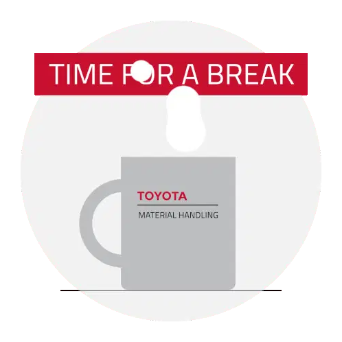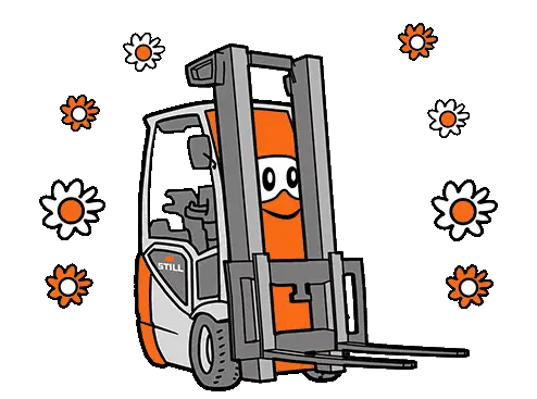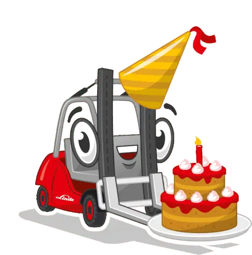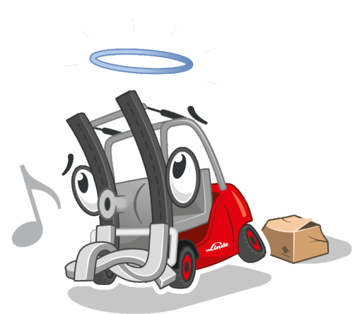 A cute Linde Lindem forklift character with a halo, whistling innocently next to a crumpled box.