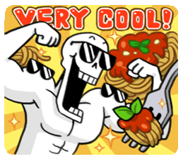 a cartoon drawing of a skeleton eating spaghetti with the words very cool written above him