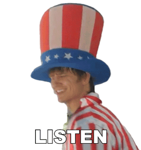 Danny Mullen, wearing an Uncle Sam hat, winks and smiles as the word 'LISTEN' appears below him.