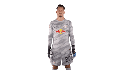 Janis Blaswich, the RB Leipzig goalkeeper, gestures to listen up, emphasizing attention and focus.