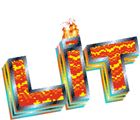 A dynamic sticker featuring the word "LIT" in a pixelated, metallic style with a flame on the 'I', conveying excitement.