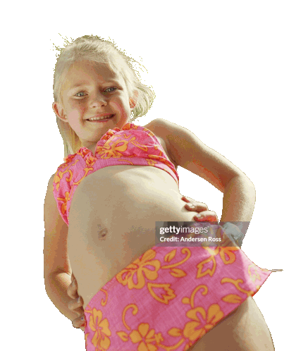 a little girl in a pink bikini is smiling and holding her hands on her hips