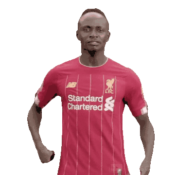 Sadio Mane, wearing his Liverpool FC kit, celebrates with an energetic expression and clenched fists.