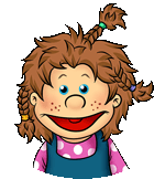 A cheerful Living Puppets girl with messy braids and freckles smiles, adorned with red hearts, expressing love.