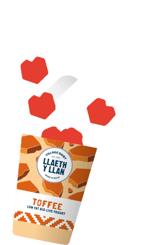 a container of toffee low fat bio-live yogurt is surrounded by red hearts