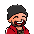 Lmlrockzlml, the Twitch streamer, laughs heartily in this pixel art sticker, wearing a beanie and red jacket.
