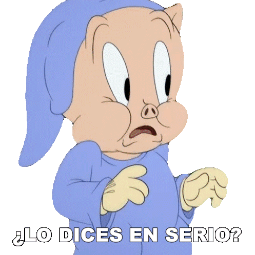 Porky Pig, dressed in blue pajamas, looks shocked and asks "¿Lo Dices En Serio?" (Are you serious?).