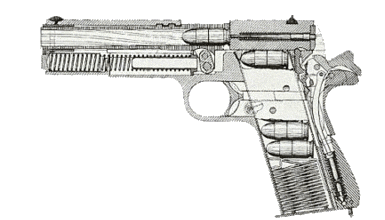 Detailed cutaway drawing of a loaded handgun, revealing its internal mechanisms and bullets in the magazine.