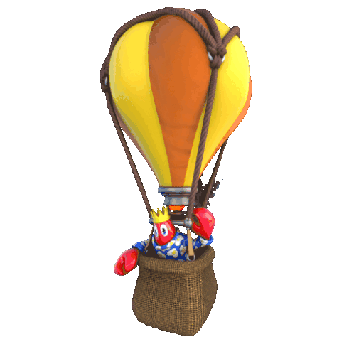 Lobster PhilipColbert, wearing a crown and boxing gloves, floats in a vibrant hot air balloon.