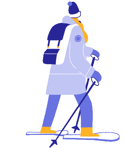Lobster Studio presents an animated character skiing in winter gear, complete with a backpack and ski poles, walking across the snow.