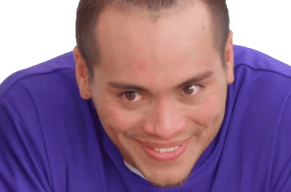 A man with a 'loco demente' expression and a mischievous, almost evil smile looks intently forward.
