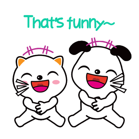 Two adorable cartoon characters, a cat and a dog, laugh hysterically with the caption 'That's funny~'.