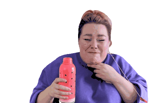 A woman in a purple top laughs and chokes on water, spitting it out with a humorous, distressed expression.