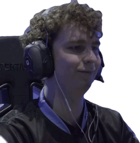 A young man, a gamer, laughs heartily while wearing headphones and a black shirt, full of joy and having fun.