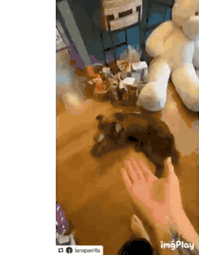 Lolaparrilla and Lanaparrilla's dog enjoys belly rubs from a loving hand, rolling playfully on the wooden floor.