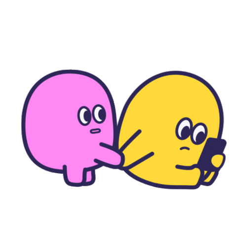 A pink blob character curiously pokes a yellow blob engrossed in their phone, seeking attention or to see the screen.