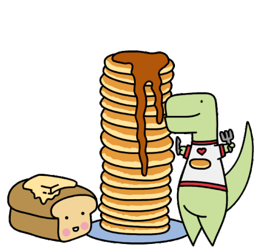 Loof the cute bread and Timmy the dinosaur are ready to enjoy a towering stack of pancakes with syrup and buttered bread.