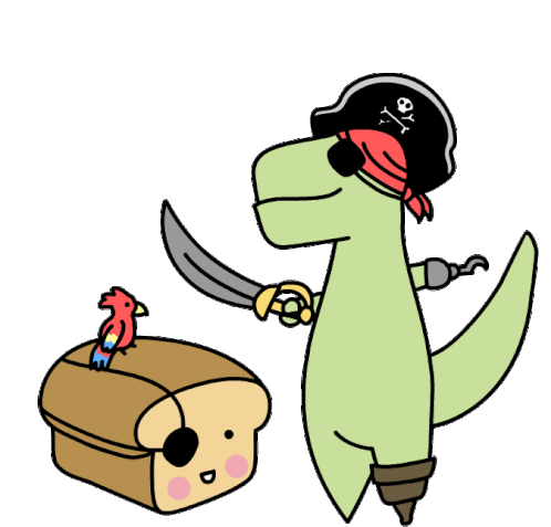 Cute pirate dinosaur Timmy and pirate bread Loof with their parrot, ready for adventure on the high seas.
