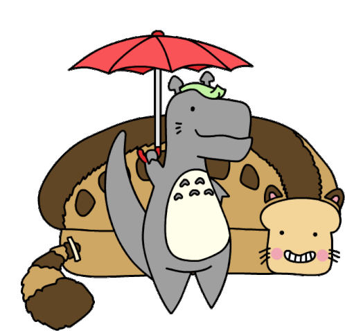 Loof and Timmy, a cute Totoro-inspired dinosaur with an umbrella, stands with a Catbus-like bread and a smiling bread-cat.