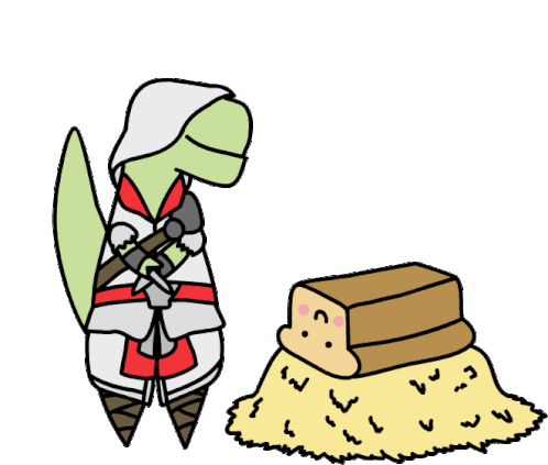 Loof the dinosaur, dressed as an Assassin's Creed character, stands next to Timmy, a cute loaf of bread on hay.
