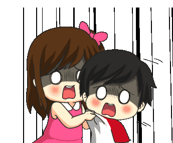 Animated sticker of two cartoon kids, a girl and a boy, looking scared and shocked with wide eyes and open mouths.
