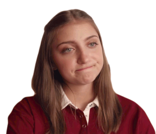 A young woman with long brown hair in a red polo shirt looks around with an unimpressed, skeptical expression.
