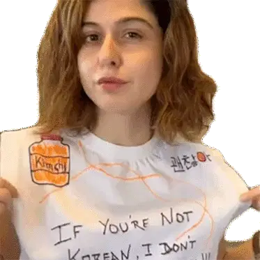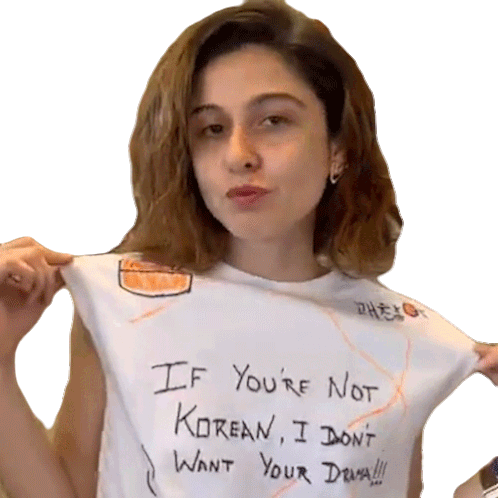 Scherezade Shroff shows off her shirt with the bold statement "IF You're Not Korean, I Don't WANT Your Drama!!!".