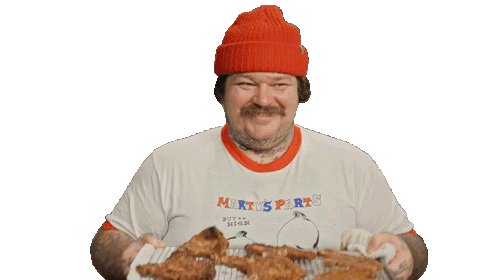 Matty Matheson, wearing a red beanie and a 'Marty's Parts' shirt, proudly presents a tray of freshly cooked meat.