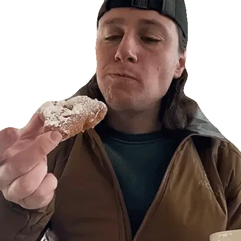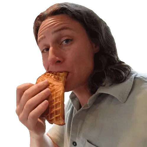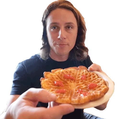 Michael Downie proudly presents a delicious waffle topped with red fruit, looking directly at the viewer with a slight smile.