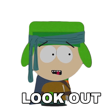 Kyle Broflovski from South Park, dressed in a fantasy costume, points with a worried expression, warning "LOOK OUT".