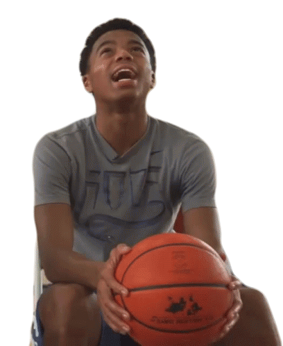 Jalen Lecque, a basketball player, sits and looks up with a happy expression, holding a basketball.