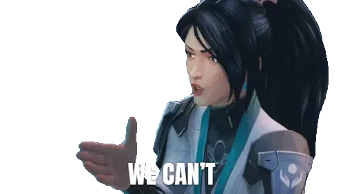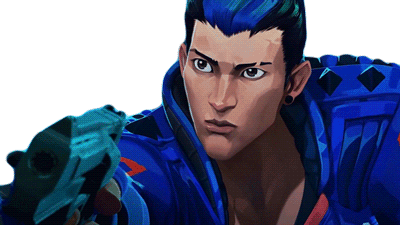Yoru from Valorant, with his distinctive blue hair, looks up intently while holding a futuristic gun.