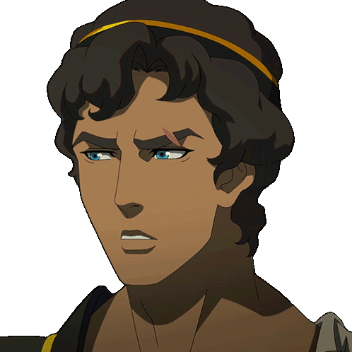 Heron from Blood of Zeus scans his surroundings with a serious and focused expression.