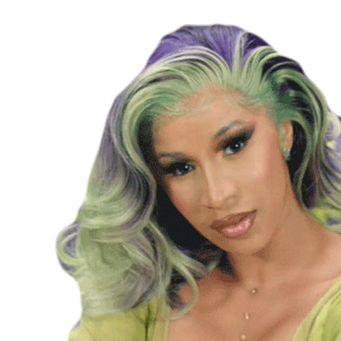 Cardi B with vibrant green and purple hair, giving a direct, captivating stare. Her head subtly moves, drawing you in.
