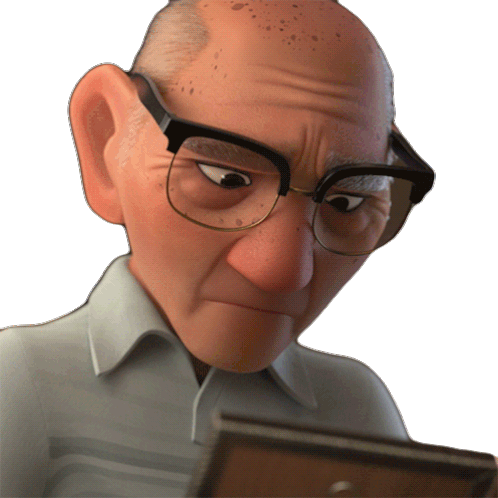An animated elderly man with glasses intently looking down at a photo frame, appearing contemplative.