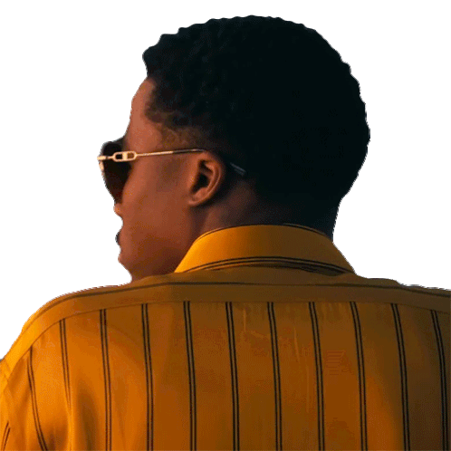Roddy Ricch, wearing sunglasses and a yellow striped shirt, turns his head to look over his shoulder with a cool demeanor.