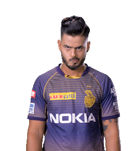 Nitish Rana, the Kolkata Knight Riders player, scans the cricket field, shielding his eyes with his hand.