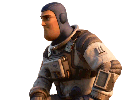 Buzz Lightyear from Pixar's Lightyear movie looks up with a determined and focused expression, ready for action in his space suit.