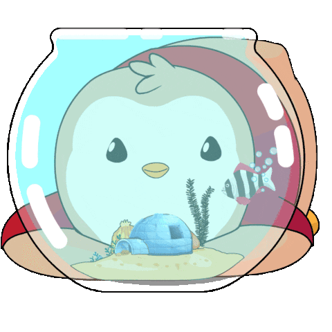 A cute pudgy penguin watches a striped fish in its fishbowl, pondering and waiting in a looping animation.