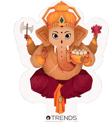 Animated sticker of Lord Ganesha, the elephant-headed deity, holding an axe, a lotus, and a bowl of modaks, with his trunk moving.