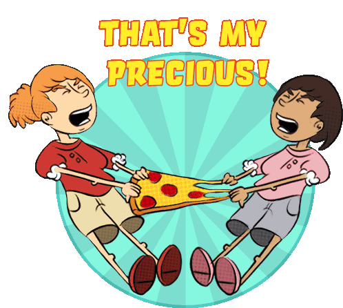 Two cartoon girls fiercely pull on a stretching slice of pizza, exclaiming "THAT'S MY PRECIOUS!" in a Lord Of The Rings meme.