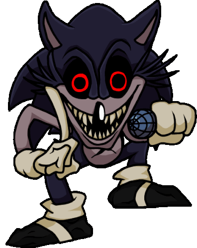 Lord X from Fate FNF, a scary Sonic.exe character, in an aggressive down pose holding a microphone.