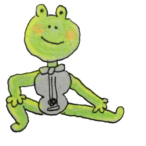 A cheerful green frog character is depicted in a serene lotus position, ready for a workout or meditation.
