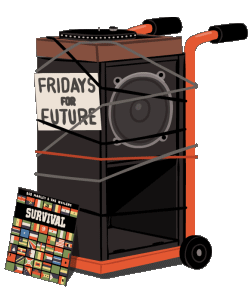 A speaker with a turntable on a hand truck, featuring a 'Fridays For Future' sign and a Bob Marley 'Survival' album cover.