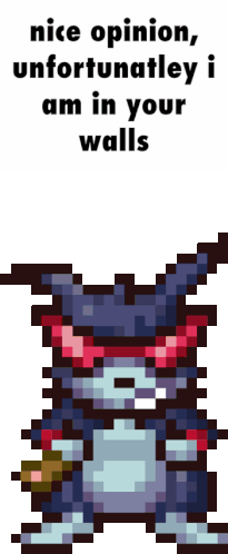 Pixel art Louie monster with text 'nice opinion unfortunately i am in your walls' meme.