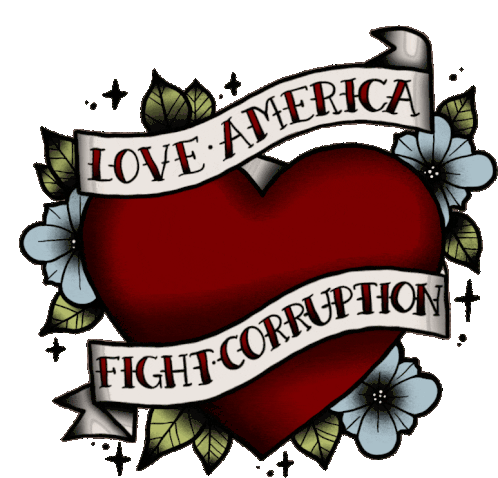 A classic tattoo-style sticker featuring a heart, flowers, and a banner with 'Love America Fight Corruption'.