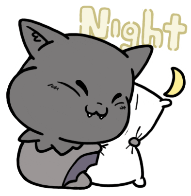 Adorable bat-like cat character hugging a pillow with 'Night' text. Perfect for goodnight wishes.