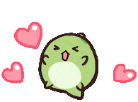 An adorable, round green frog character with a tiny crown, happily jiggling amidst floating red heart pixels, expressing love.